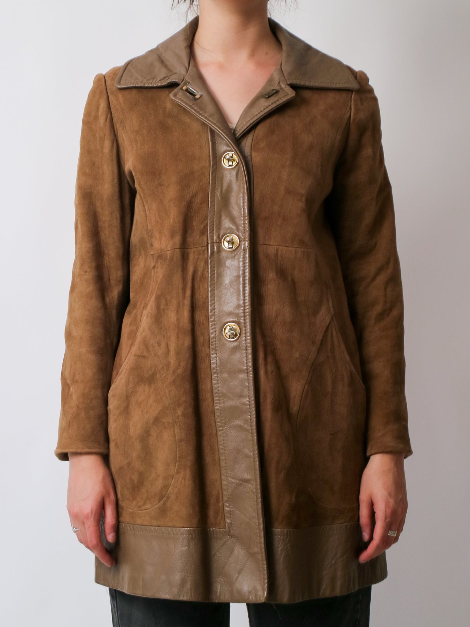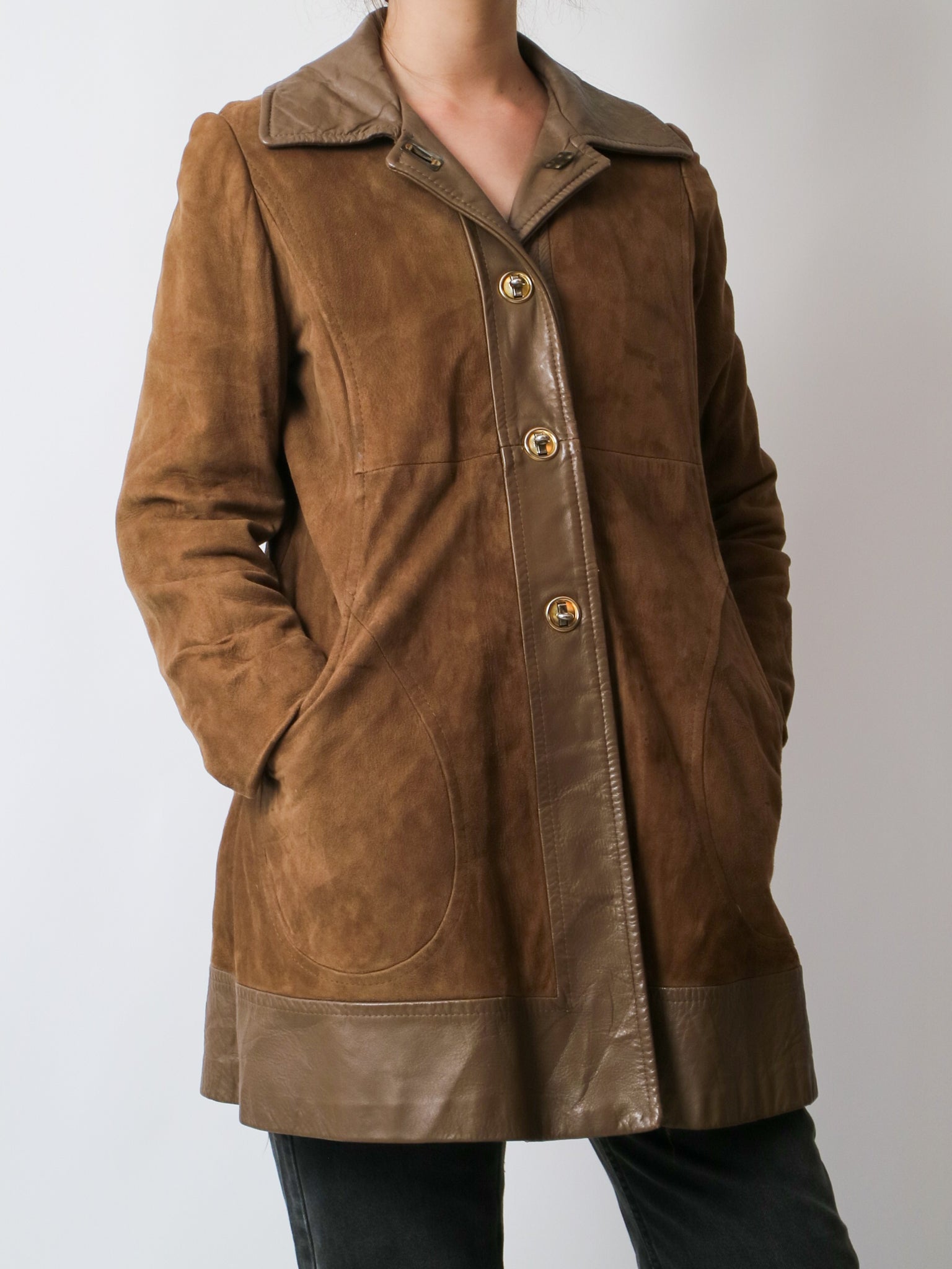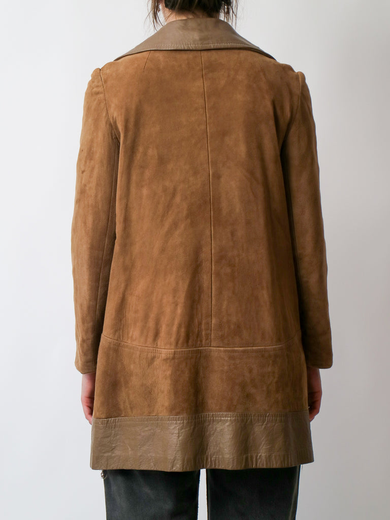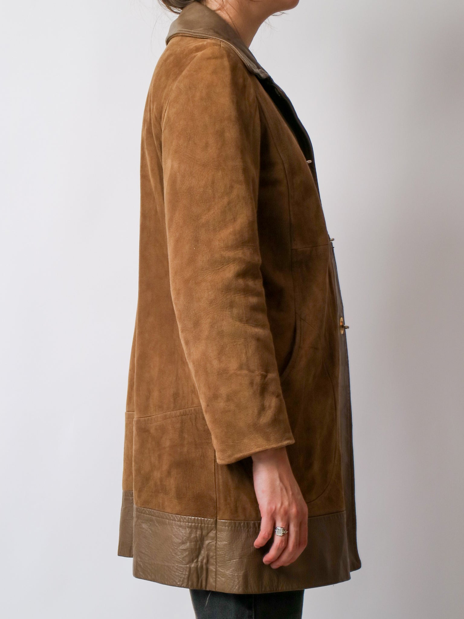 Era: fantastic Bonnie Cashin style suede mod coat with leather trim and gold turnlock closures