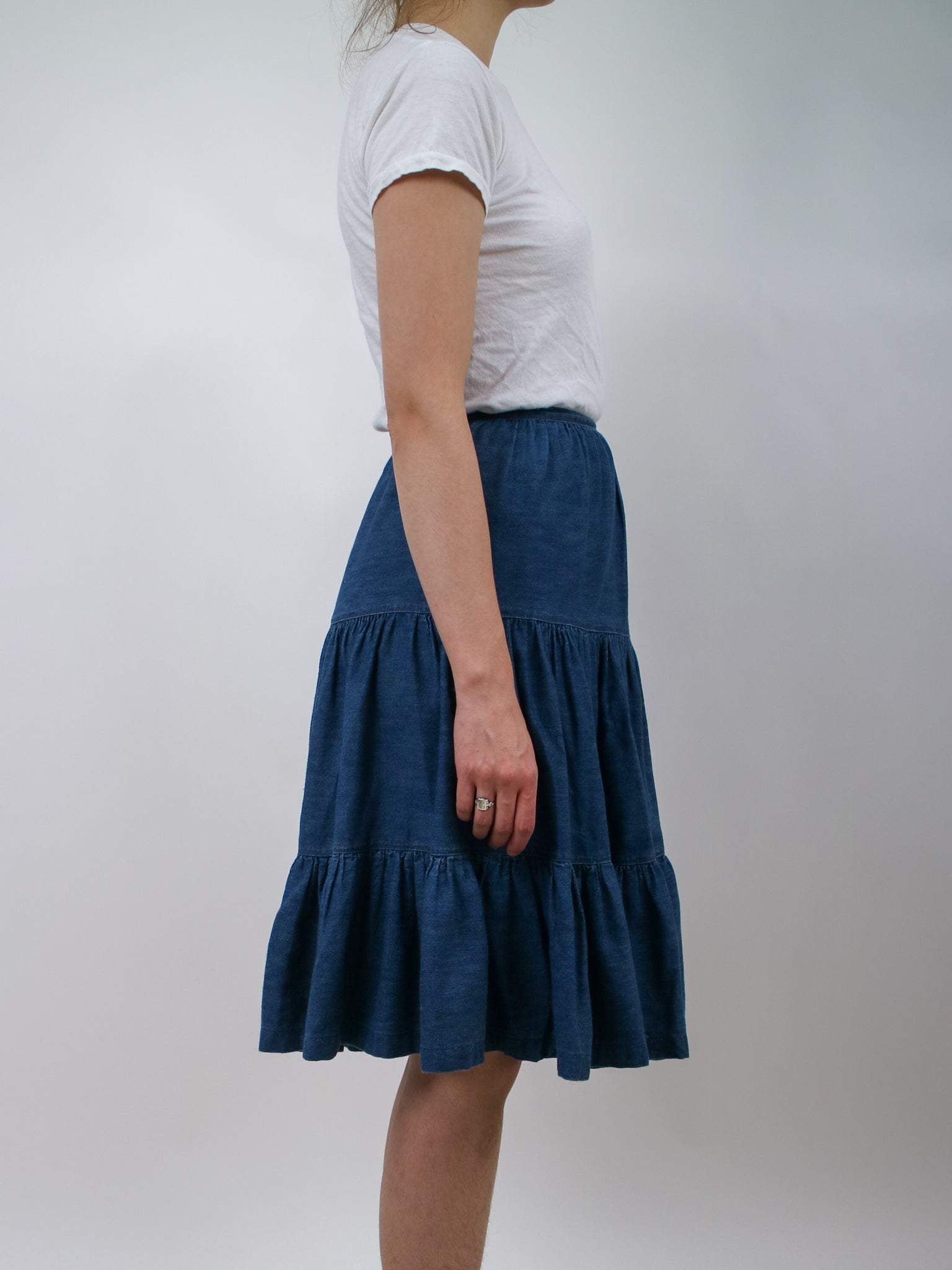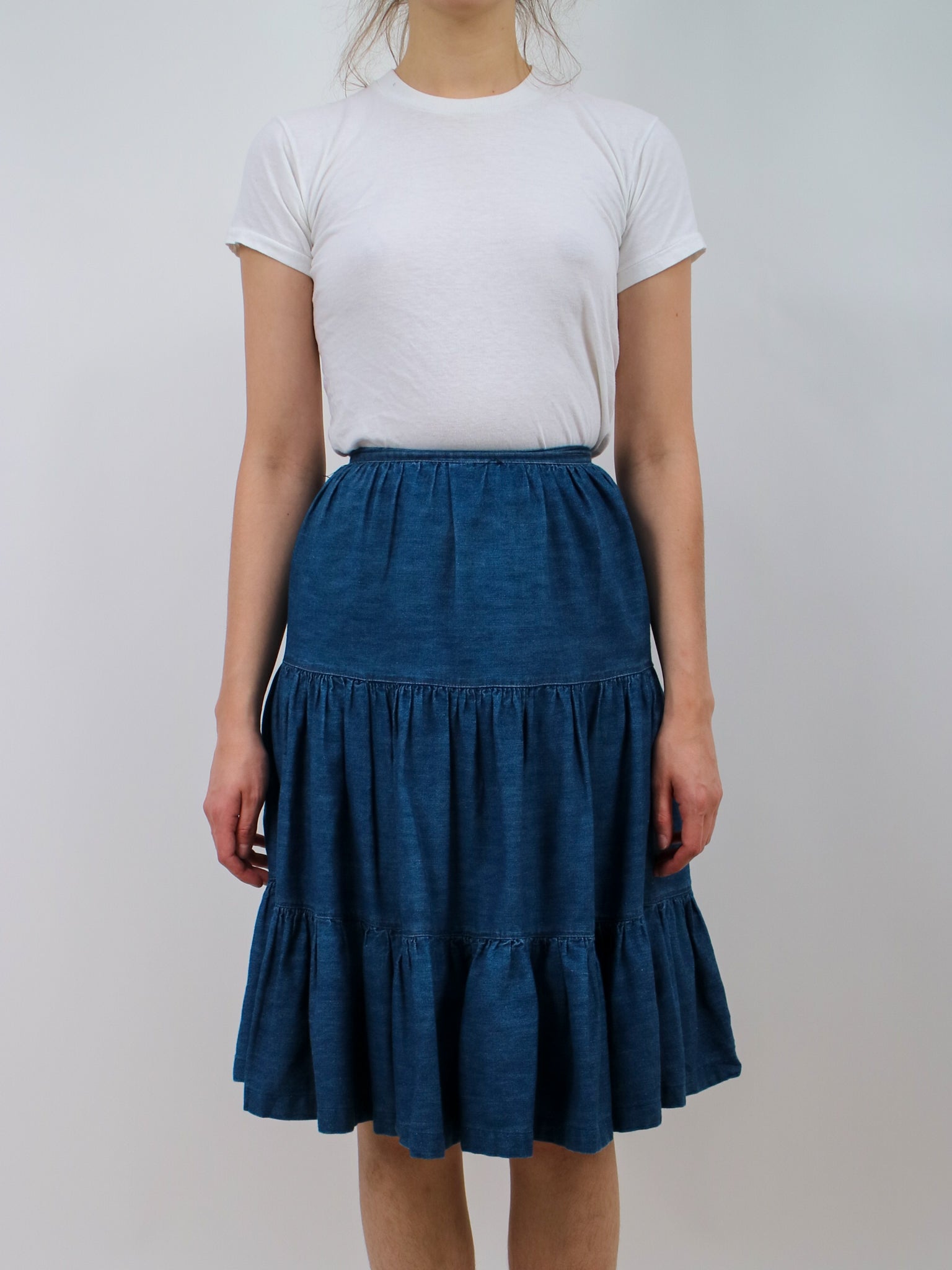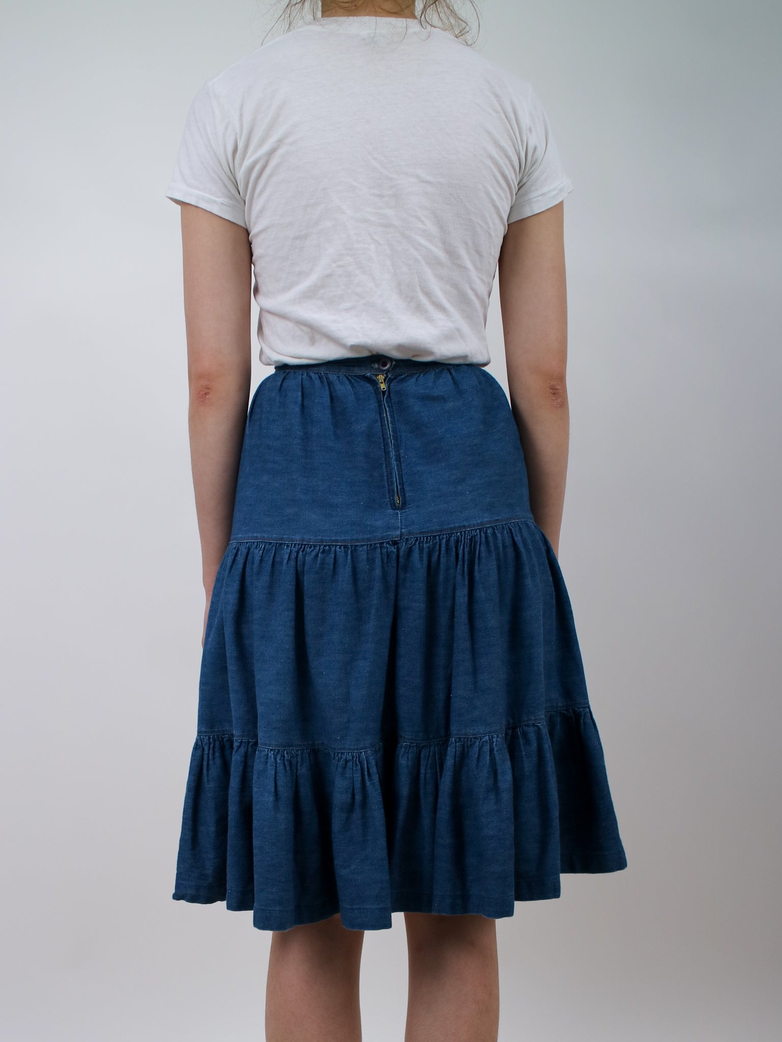 1970s Darkwash Denim Tiered Ruffle Midi Skirt V153
