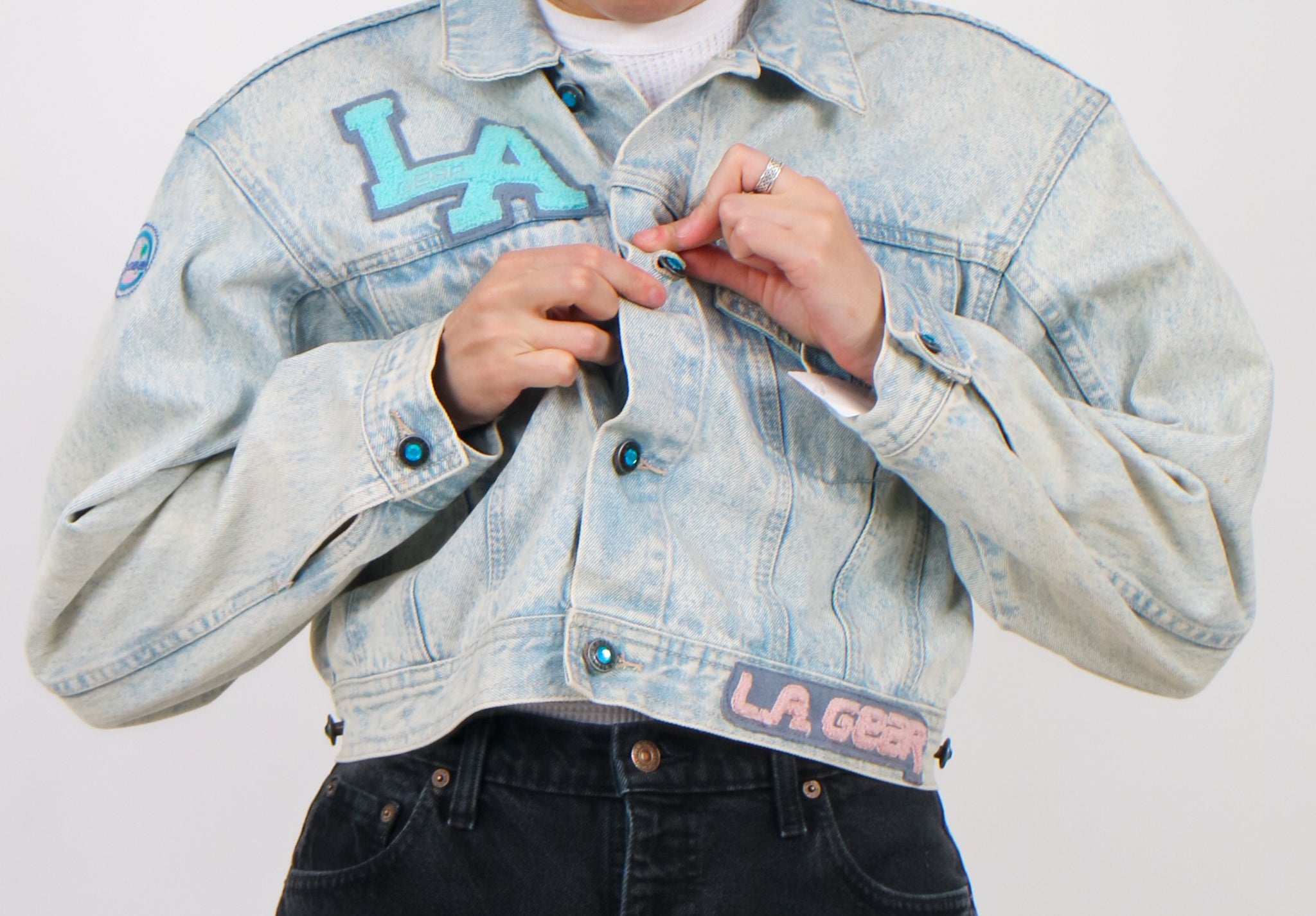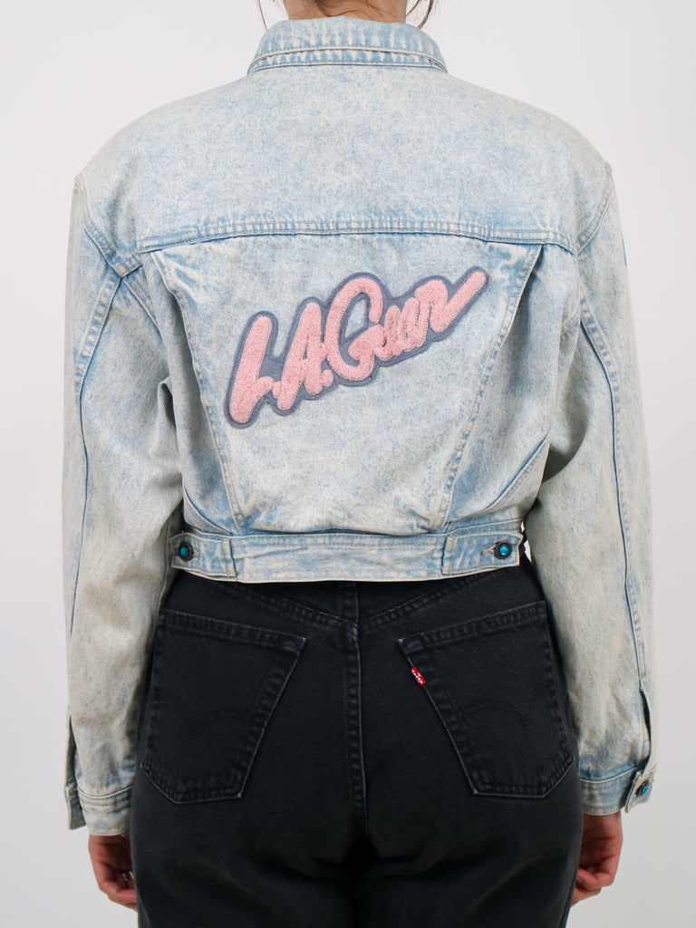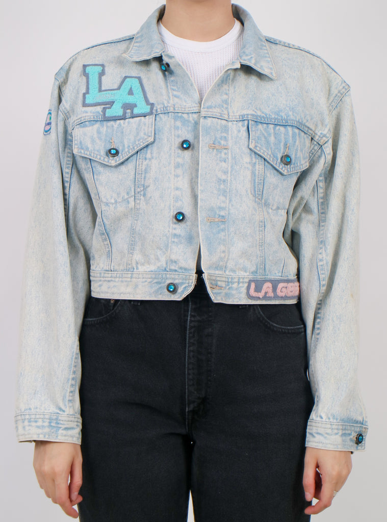 1980s LA gear light acid wash cropped letterman denim jacket v306