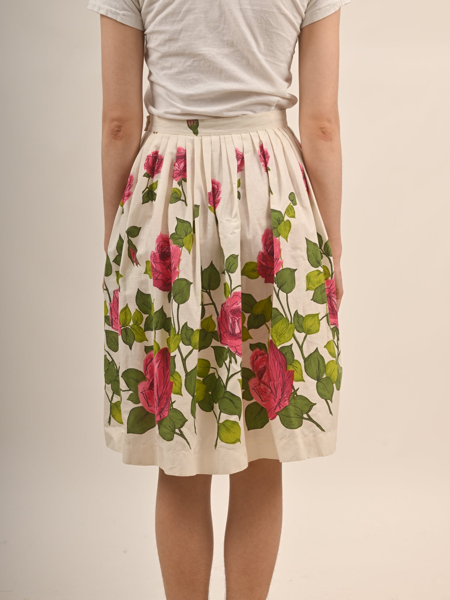 Classic 1950s circle skirt with a white background with bright pink roses and green foliage