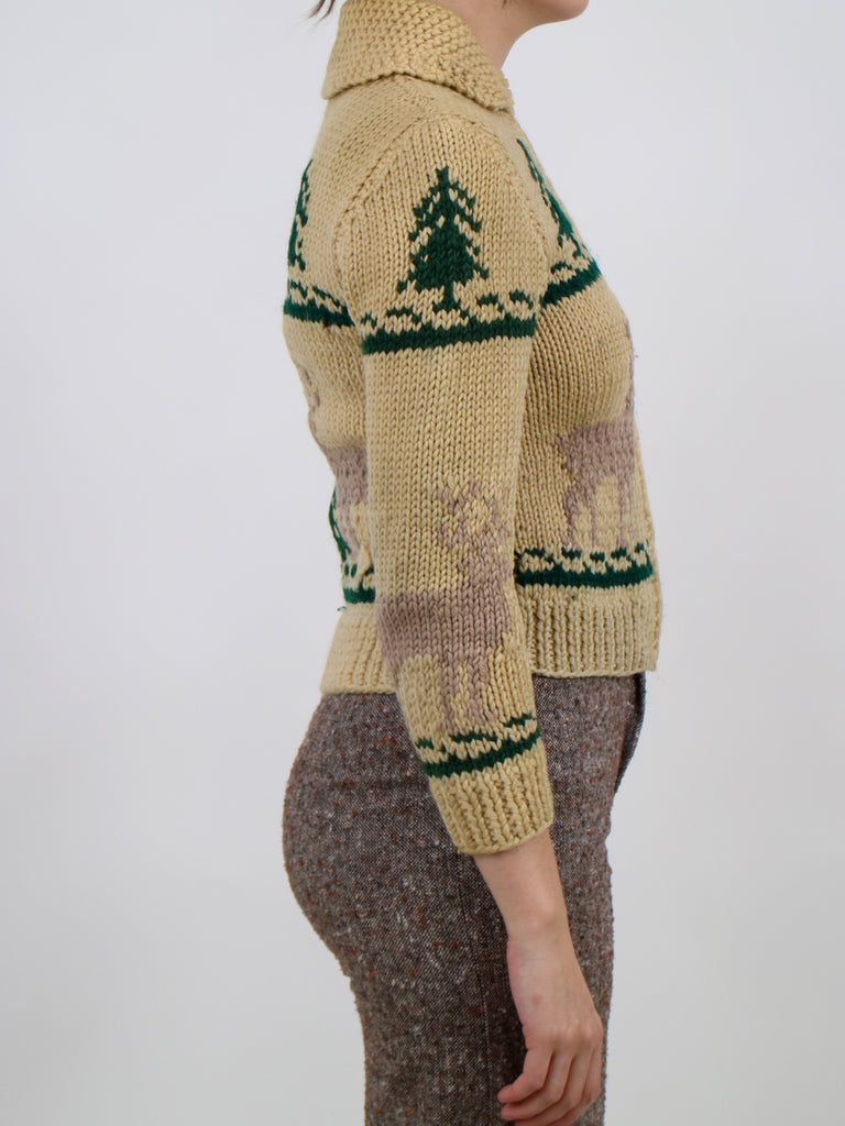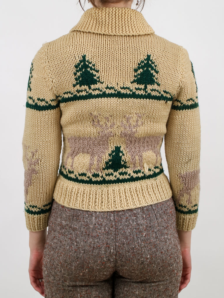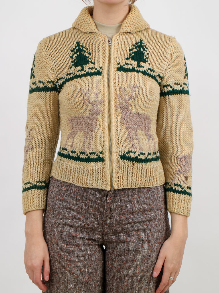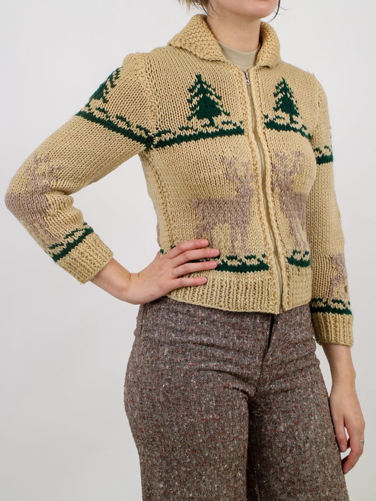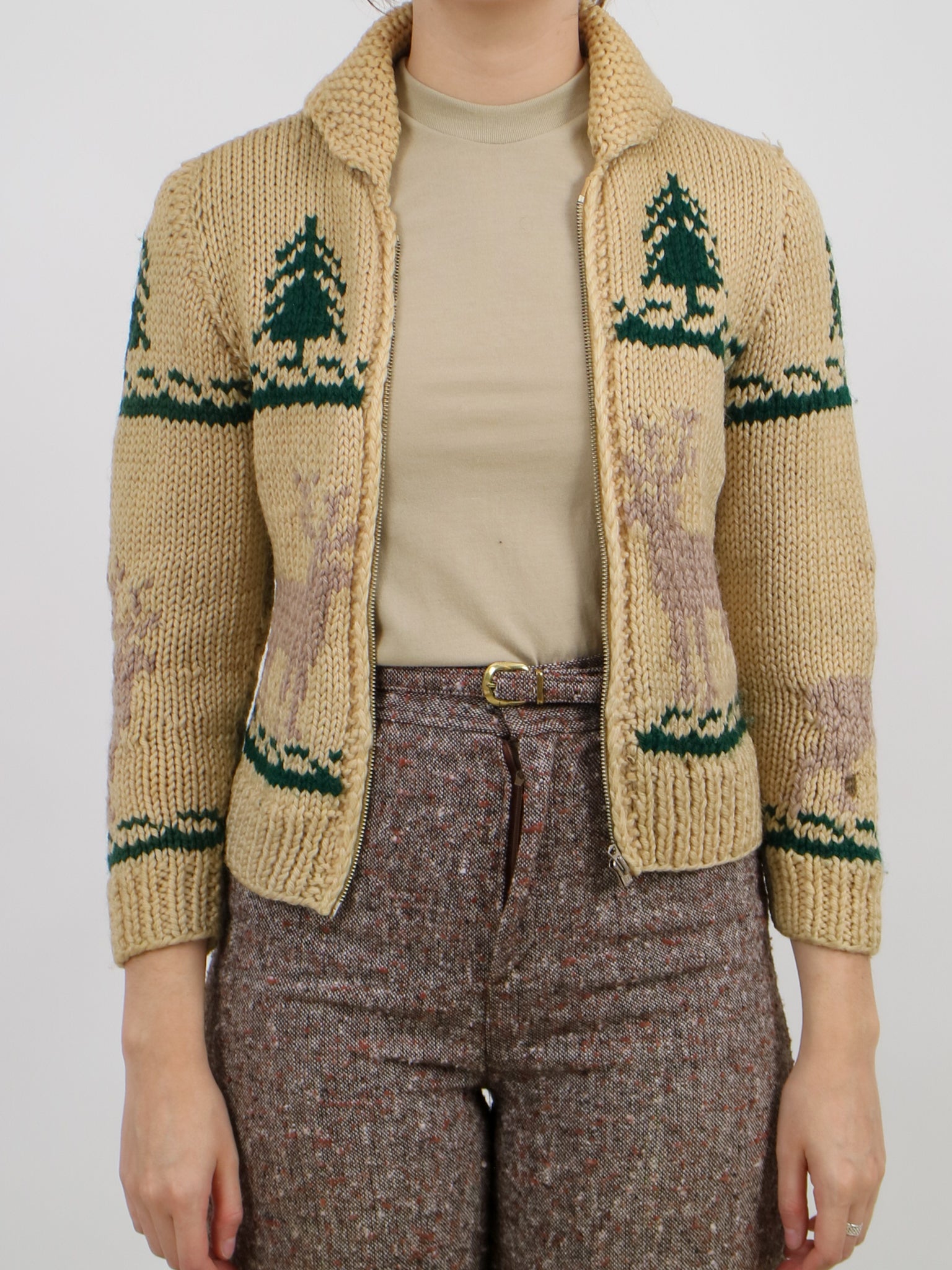 Era: 1950s cowichan sweater with a front zip and forest scene