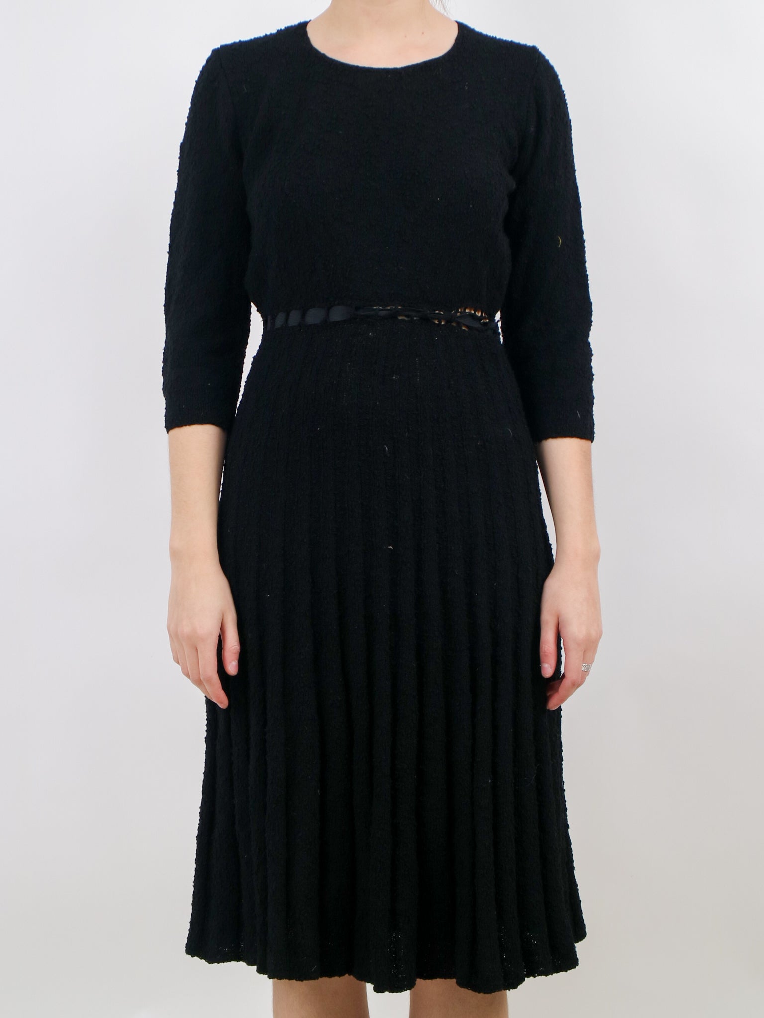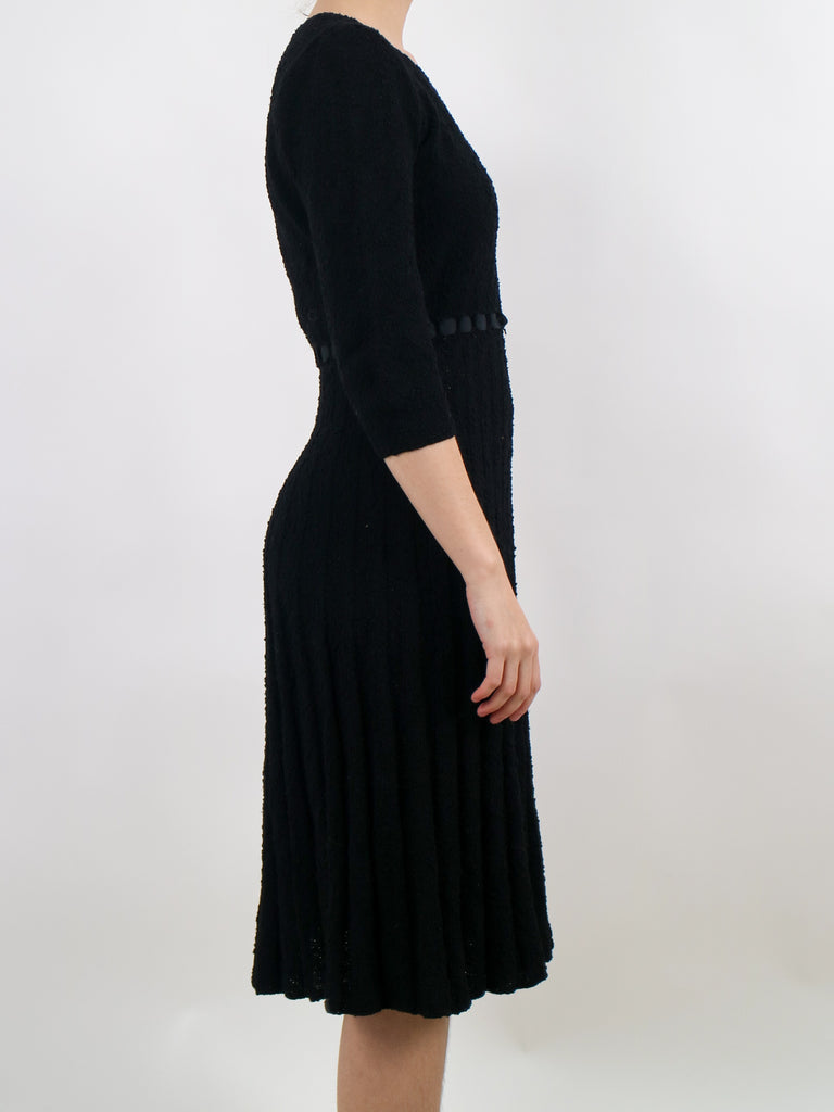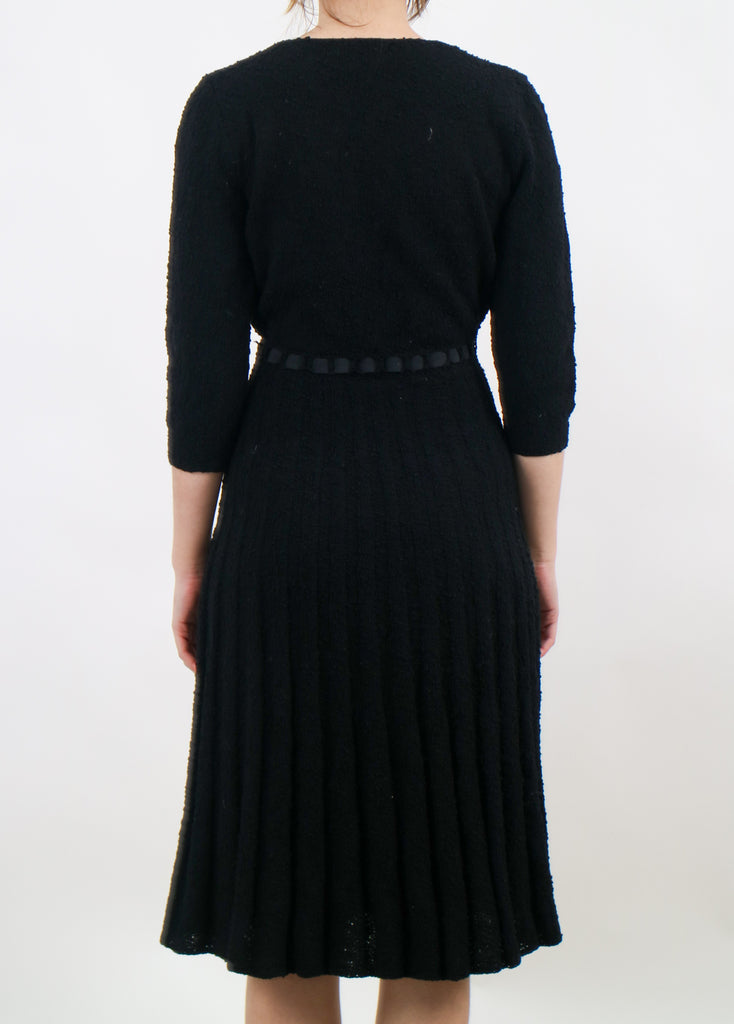 1950s handmade black knit wool stretchy sweater dress v324