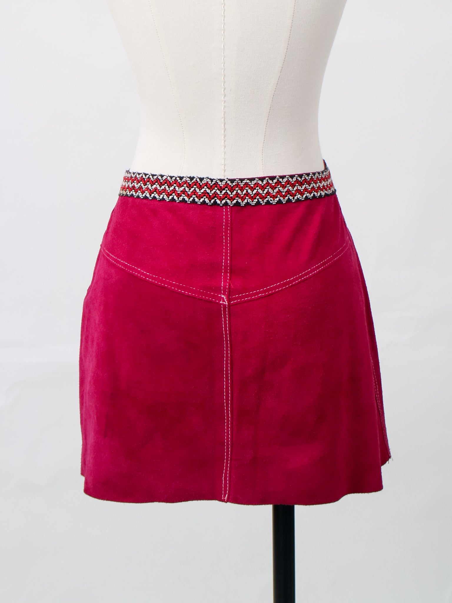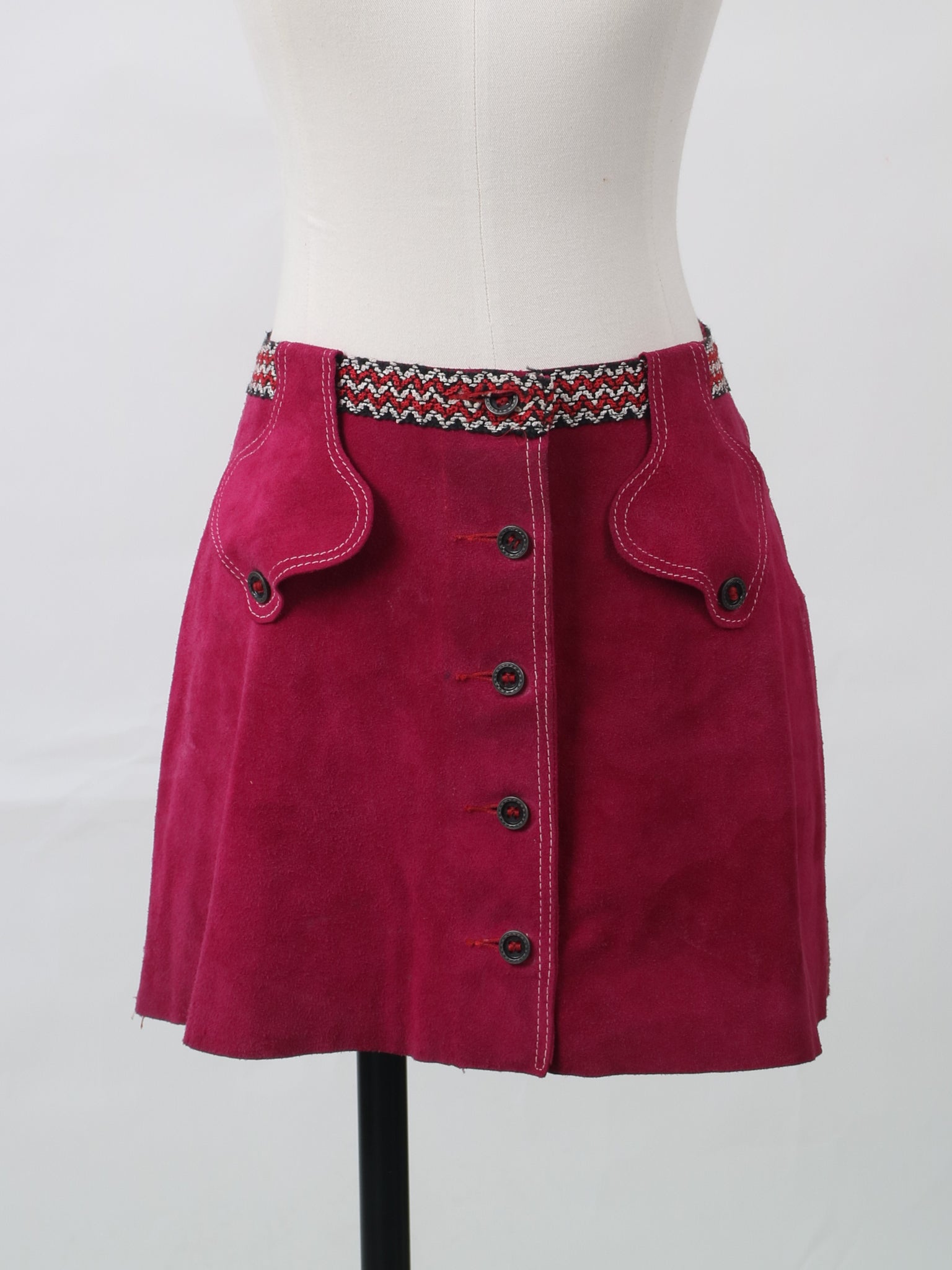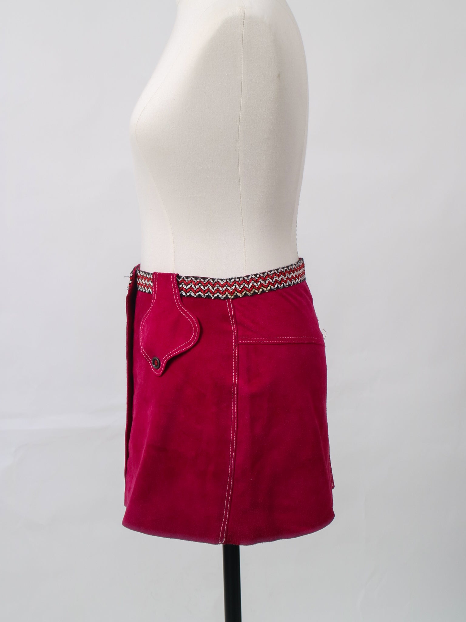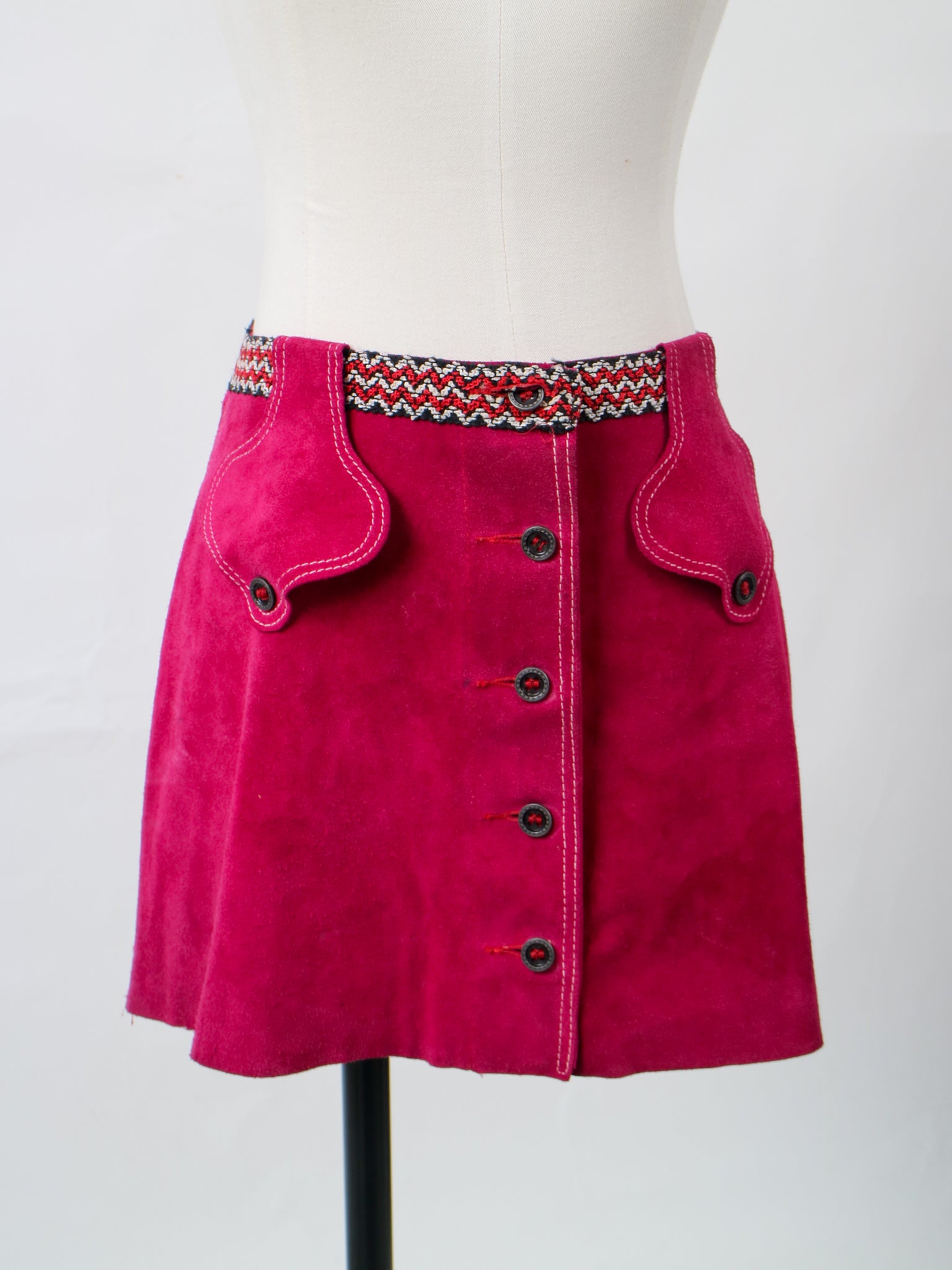 Product details: 1960s hot pink/fuchsia suede button up mini skirt with white stitching