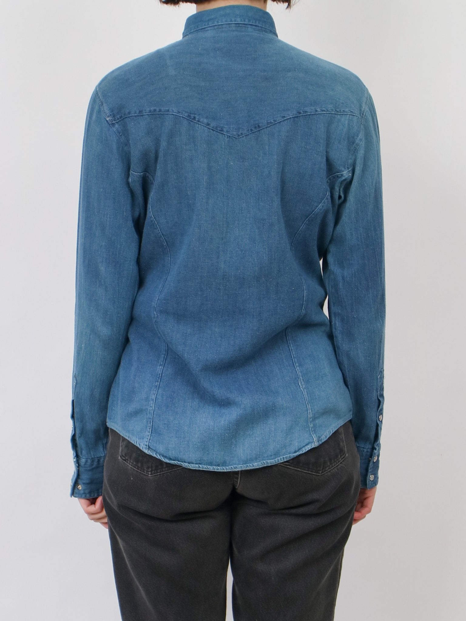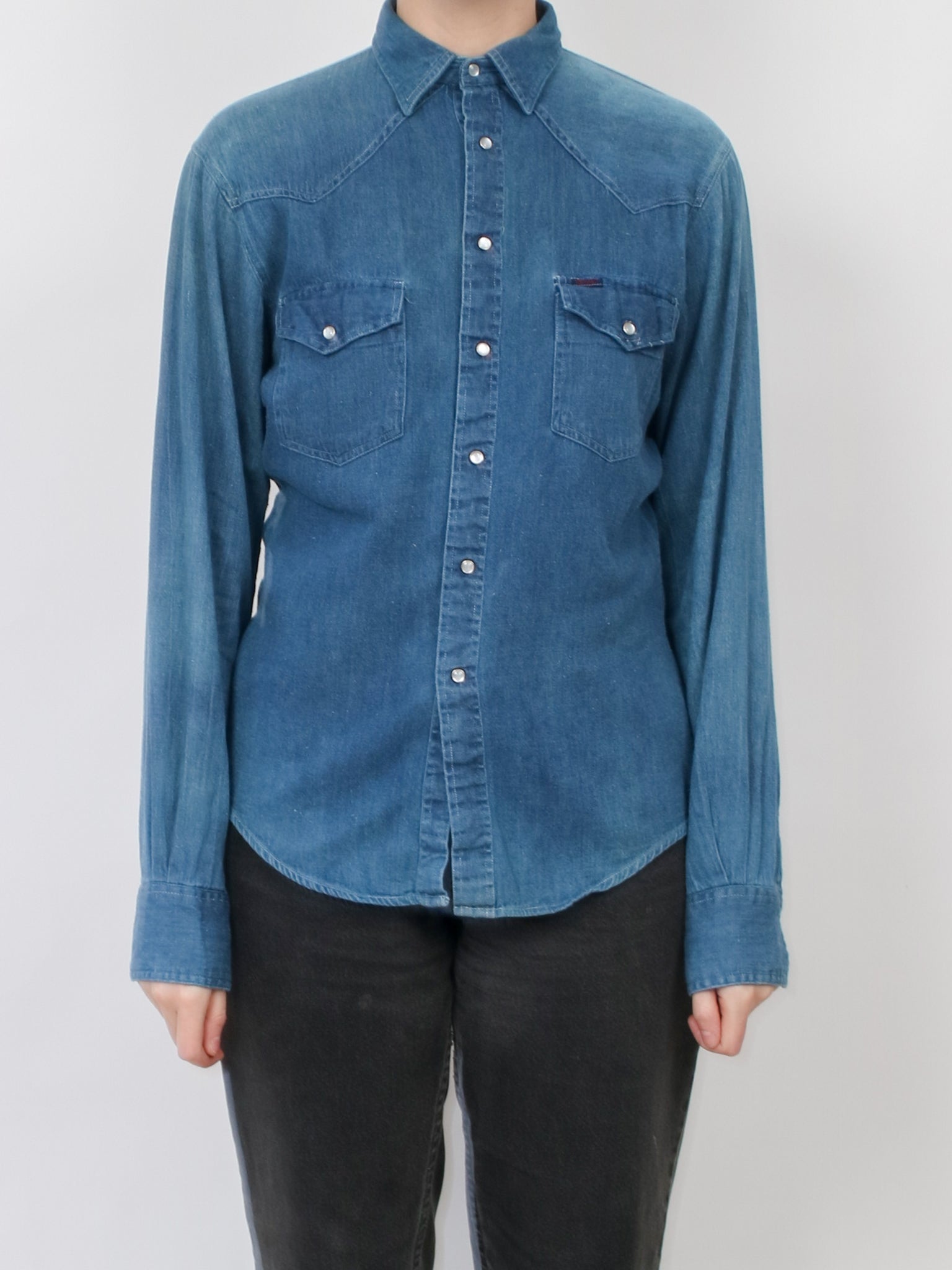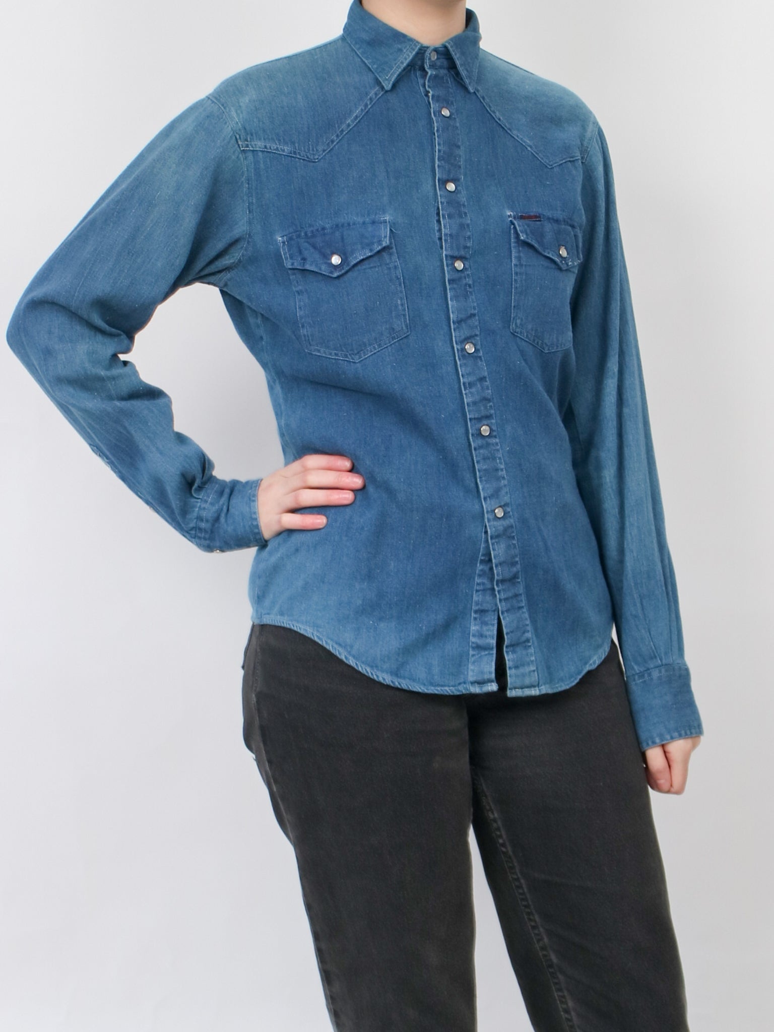 Product details: late 70s brushed cotton denim britannia snap front western style jean shirt, yee haw!