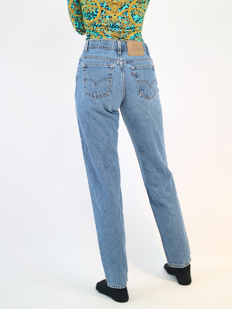 Vintage 90s jeans by Levis with a high waist and a relaxed fit and tapered leg in blue denim. 7 long. Made in USA